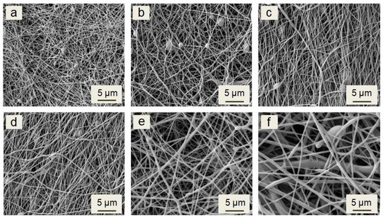 The morphology of all investigated electrospun membranes is shown on micrographs in Figure 1. The membranes contain randomly oriented continuous fibers. The beads are rarely observed. The imperfections of morphology could be caused by the impossibility of controlling the ambient environment parameters, such as temperature and humidity. According to previous studies, temperature and humidity could affect the morphology and fibers or beads formation [33,34,35,36].