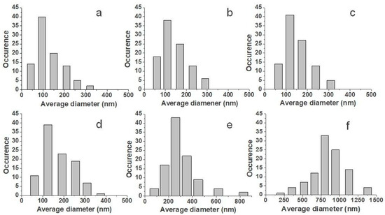 Distributions of fibers diameters: PCL (a), PCL/2% N (b), PCL/6% N (c), PCL/12% N (d), PCL/25% N (e), and PCL/50% N (f) fibrous membranes.