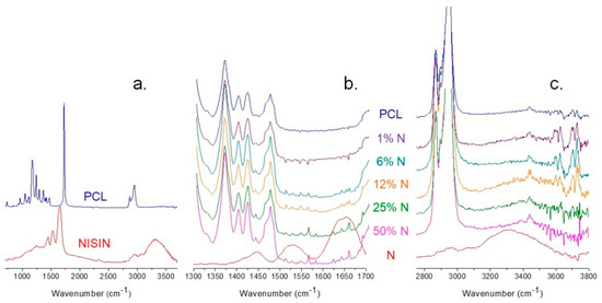 The infrared spectra of (a) plain PCL and nisin, and comparison of plain samples to the composites PCL/nisin samples in detail in regions (b) 1300–1700 cm−1 and (c) 2750–3800 cm−1.