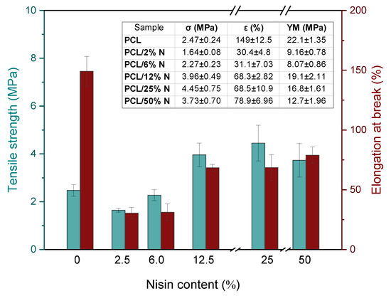 The mechanical properties of PCL and its composites containing nisin are summarized in Figure 5. As it is clearly seen from the inset table, the initial low nisin concentration leads to a significant drop in elongation at the break due to the preferable interaction of nisin particles with each other, resulting in the forming of bulkier bundles. This hypothesis is supported by the nature of nisin bearing numerous representations of polar amino and hydroxyl functional groups that can prefer mutual interaction and de facto act as cross-linkers. Initial lower nisin amount caused a slight decrease in the tensile strength values in comparison to neat PCL due to a worsening of the compatibility and disintegration of the initial arrangement of the polymer chain in the material. With an increasing nisin concentration, a gradual increase in both the tensile strength and elongation at break occurred due to more numerous interactions within the composite material between the polymer matrix and the filler particles. This phenomenon was also supported by the comparison of the Young´s modulus values, which showed the same tendency of the initial drop at lower nisin concentration, up to 6%, followed by a sharp increase to the values close to the ones of the neat PCL matrix.