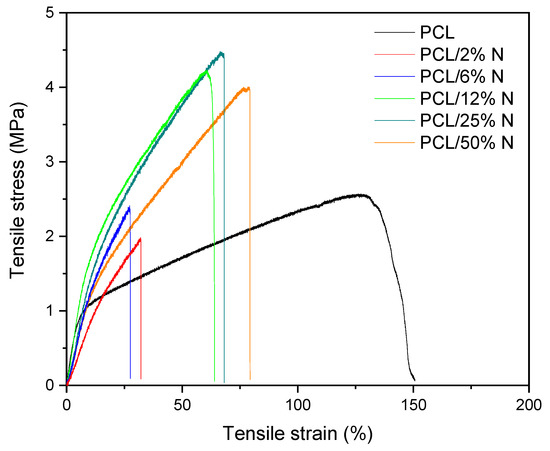 Stress–strain curves for plain electrospun PCL and PCL mats with different concentrations of nisin solution varied from 0 to 50%.