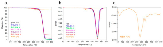 The thermal decomposition curves of obtained membranes indicated a single mass-loss step. Figure 7 depicts the thermal stability of the investigated samples. The thermal stability was studied in an inert atmosphere from room temperature to 500 °C using the TGA instrument. From the TGA records, it can be seen that all samples had a very similar course. In terms of thermal stability, the addition of nisin did not influence PCL at all. The decomposition of all the PCL/N samples started around 380 °C. However, the remaining weight after the deterioration step differed depending on the membrane’s composition. A higher addition of nisin meant a higher amount of material residue at that temperature. The literature shows that the mass loss of nisin around the temperature of 600 °C is close to 10% wt [44]. From Figure 7, the highest amount of residue of the sample was for the sample with the highest addition of nisin. The residue of that sample (PCL/50% N) was around 14% wt at 500 °C. The first-order derivative (Figure 7b) confirmed that the temperature of decomposition of PCL and PCL/N was about 400 °C. Moreover, Figure 7c shows the first derivative of nisin TGA in detail.