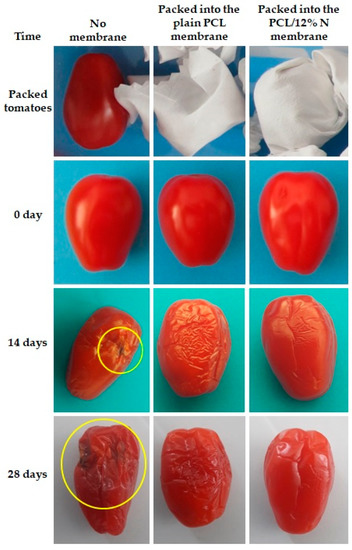 The first symptoms of tomatoes spoilage, regardless of the packaging, were observed after 14 days of storage. However, it is worth noticing that fruits stored in nonwoven fabric loaded with nisin demonstrated the lowest degree of spoilage compared to fruits packaged in open plastic containers and plain PCL fibrous mats. After 28 days of storage, spoilage was observed mostly on fruits stored in a plastic container and plain PCL mat; meanwhile, fruits packed with the PCL/12% N membrane kept a freshness comparable to that of the fruits after 14 days.