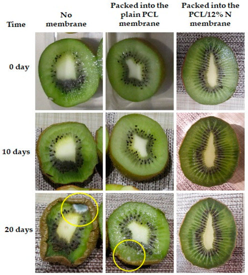 Kiwi fruits are commonly known as fruit with a high susceptibility for spoilage; for this reason, the period of observation was shortened and divided into two, namely after 10 and 20 days. The tendency of kiwi fruit to spoil was similar to that of tomatoes. After 10 days, the first symptoms of spoilage were observed; however, the degree of spoilage was the lowest for fruits stored in nonwoven mats of PCL loaded with 12% of nisin. It has to be highlighted that after 20 days, kiwi fruits were still fresh and unspoiled when packed into nonwoven fabrics of polycaprolactone loaded with nisin. The prolongation of fresh fruits packed with plain PCL fibrous mats was probably caused by the porous electrospun mats’ easy air and water permeability, as discussed before [46]. Based on the obtained results devoted to the impact of the type of packaging on the freshness of selected fruits, it can be concluded that the addition of nisin plays a role as an active factor in facilitating the prolongation of freshness by inhibiting the spoilage process and simultaneously enhancing the shelf life of fruits.