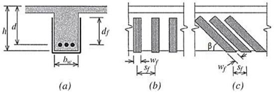 ACI 318-14 (ACI 2014) [26] is used for the evaluation of concrete (Vc), steel stirrup (Vs) and FRP (Vf) contributions. According to the symbol notation in Figure 1 and Abbreviations, Vc (nominal shear strength provided by shear reinforcement) is calculated as: