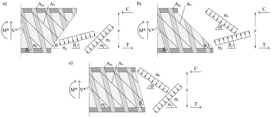 cot θ < 1: It implies that cot θ = 1.0 must be assumed, and the failure is due to reaching the stress limit in the concrete strut and in one of the shear reinforcements. If it is assumed that β < α, then the maximum shear strength of the beam is given by the minimum value obtained via Equation (10) assuming that the FRP reinforcement attains the maximum effective strain in tension f = 1 or by Equation (11), considering that the yielding in the steel stirrups is attained, having s = 1. In Appendix B, the above three different cases are elucidated by calculation examples.
