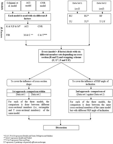 To cover the main aspects of the research (influence of cross-section shape and angle of FRP inclination), two data sets and two comparison approaches were adopted which are explained in Figure 3. The beams included in the database have effective depths of the cross section in the range of 155 mm and 831 mm, while the shear span ranges between 2.3 m and 3.8 m. The transverse internal steel reinforcement is constituted by vertical steel stirrups whose maximum geometrical ratio is 0.48%.