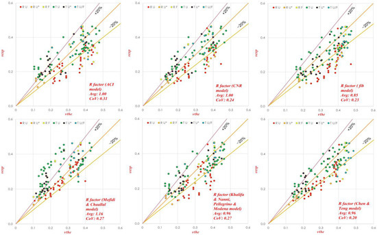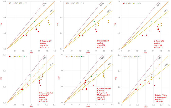 To evaluate shear strength, six different effectiveness factors “R” were used. All of these have different approaches to deal with the strengthening of FRP. The first two R factors were used in [19]; the first was derived according to Khalifa and Nanni and Pellegrino and Modena [22,23,24]. The effectiveness factor is taken as the minimum among the four coefficients (R1, R2, R3, R4), which represent different modes of failure. R1 considers the tensile failure of the FRP, while R2 and R3 represent the debonding phenomenon and failure of the FRP due to shear crack width, respectively. Lastly, R4 considers failure due to peeling of the concrete cover.