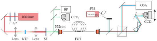 The experimental setup for investigation of the self-seeded IM-FWM process: P—polarizer, λ/2—half-wave plate, KTP—nonlinear crystal, SF—short pass filter, FUT—fiber under test, BP—beam profiler, PM—power meter, CCD—digital camera, OSA—optical spectrum analyzer, PB—Pellin–Broca prism.
