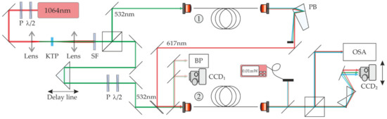 The red-wavelength Stokes beam generated in one section of FUT was utilized as a signal beam and coupled with an intense pump beam (532 nm) to the second segment of the same type of fiber. Because both beams are pulsed, it is also crucial to match both pulses in the time domain. For that purpose, a pump beam coupled to the second segment of the FUT was routed through a delay line that compensates for the additional optical path taken by a signal beam (Figure 3).