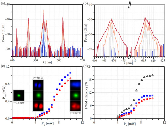 The spectra of the optical output field as a function of the pump’s power are presented in Figure 4a,b. The intense peaks centered at 617 nm and 470 nm can be clearly assigned to the FWM origin, as the Stokes and the anti-Stokes beams, respectively.