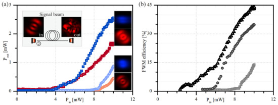 As presented in the inset of Figure 5a, the modal profile of a signal beam indicates a mode LP12 that corresponds precisely to the mode number of a Stokes beam, generat-ed spontaneously in the second stage of FUT. The output field of a signal beam that propagates without an intense pump beam (inset of Figure 5a—left panel) indicates that the selective excitation of the higher-order mode (LP12) has not been achieved. Notwithstanding, the wavelength of a signal beam corresponds precisely to the Stokes beam and can be effectively gained along with the propagation in the second fiber. We think improvements in the signal beam coupling that would lead to the selective exci-tation of only the LP12 mode would enable even greater efficiency of the self-seeded IM-FWM process.