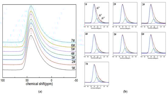 The 27Al NMR spectra of boron-doped lithium aluminum silicate glass are shown in Figure 1a. The 27Al MAS NMR peaks of the seven glass samples were all asymmetric composite peaks with a relatively broad distribution due to the quadrupole-broadening and localized-bonding environment related to compositional complexity, and the chemical shift in the resonance peak was ~42 ppm; the peak shapes were also roughly similar, indicating that the morphologies of the aluminum in the glass samples were relatively similar. With the increase in boron oxide content, the chemical shift in the peak shifted to high field, which may have been due to the fact that the oxygen in the Al–O bond carries low formal charge, and the amount of non-bridging oxygen in the Al–O network may be decreasing or the second element adjacent to it may change (BIII or Si is preferably to BIV and AlIV) [41]. In addition, the spectral peak widened asymmetrically toward the low-chemical-shift direction, which may have been related to the appearance of the high coordination of aluminum ions and the change in quadrupole-coupling parameters.