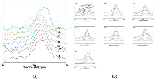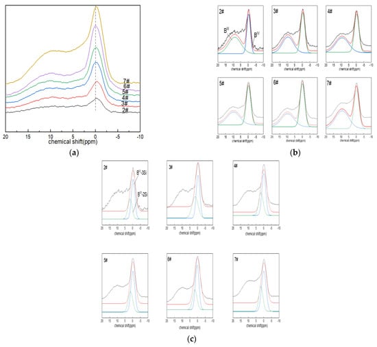 The peaks of the 29Si NMR spectra ranged from −90 to ~−130 ppm (Figure 3a), centered on a broad resonance of −110 ppm. With the increase in boron oxide content, the spectral peaks tended to shift to the low field of ~−150 ppm, which was related to the existence of aluminum or boron atoms in the silicon–oxygen tetrahedron and the non-bridging oxygen number in the silicon–oxygen tetrahedron. The chemical shift in the spectral peaks of glass sample No. 7# was the most obvious. The presence of boron or aluminum resulted in a shift in the chemical shifts, and the substitution of [SiO4] with AlIV or BIV increased the chemical shift values by approximately 5 ppm [44]. Similarly, the presence of non-bridging oxygen atoms within the silicon coordination polyhedron caused the peaks to shift toward the high fields due to the high formal charge carried by oxygen [41].