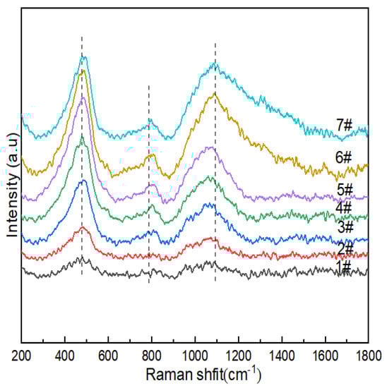 The wave-number Raman spectra of the glass sample in the range of 200–1800 cm−1 are shown in Figure 4; there were characteristic peak intensity responses at 400–470 cm−1, 700–900 cm−1 and 900–1200cm−1. The vibrational peaks of 1#~7# were concentrated at ~480 cm−1, which indicated that more 5- and 4-membered rings formed in 2#, 3# and 4#. The peak at 470 cm−1 was attributed to the mixed tensile bending vibration mode of Si-O-Si, and with the increase in B2O3 (mol%), the peak intensities of 1#~6 # gradually increased, while the peak intensity of 7# decreased. Combined with 29Si NMR, it can be seen that the content of Q4(0Al) decreased, and the connectivity of the silicate sub-network of glass changed. The vibrational peak at ~760cm−1 was the stretching vibration of the Si-O-Al linkages between [AlO4] and [SiO4] formed after Al3+ in the composition entered the network. The peak observed at ~770 cm−1 was attributed to the tetrahedral coordination of boron in glass due to the higher vibrational intensity of glass with high boron and low Na2O contents (e.g., 6#), while the opposite was true for glass with high Na2O and low B2O3 contents, which indicated that the modifier (such as sodium ions) functioned as a charge compensator, changing the neutral [BO3] unit into [BO4]-, thereby improving the aggregated state of the glass structure. It may have been formed by the breathing vibration of [BO3] of the three-membered ring at ~803cm−1. Combined with 11B NMR, it can be seen that its effect was relatively weak. In the range of 900-1200cm−1, we observed the Si-O stretching vibration in the silicon–oxygen tetrahedron, while the band at 920cm−1 could be attributed to the [BO4]- containing structural unit, while the stretching vibration mode of the mixed Si-O-B linkages was also expected to function in this range [46]. In borosilicate glass, it is generally believed that for low-modified oxide additions (R < 0.5), triangular [BO3]0 converts to a [BO4]- tetrahedron, and many NMR results are still interpreted to support the existence of [BO4]- only being connected with the four silicate tetrahedra and not with the borate network. The boron content of the lithium–aluminosilicate glass system studied by the subject was low, and the band intensity related to borate was not as strong as the Si-O stretching vibration peak in the silicon–oxygen tetrahedron in the range of 900~1200 cm−1. With the increase in B2O3 (mol%), the peak intensity at 770 cm−1 gradually increased, which indicated that the content of [BO4] in glass increased, which was consistent with the calculation results of 11B NMR fitting. The band at 1080 cm−1 had a B-O stretching mode of tetrahedral borate units with a slight increase in peak intensity.