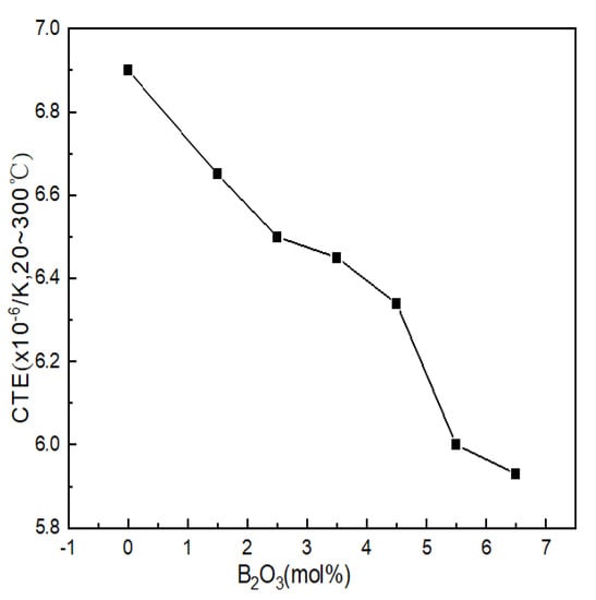 The coefficient of thermal expansion reflects the ability of the glass structure to resist deformation when heated and is one of the ways to characterize the properties of glass. The thermal expansion curve of Li2O-Al2O3-SiO2 series glass with different B2O3 contents is shown in Figure 5. The thermal expansion coefficients of the seven groups of samples were 6.90 × 10−6/K, 6.65 × 10−6/K, 6.50 × 10−6/K, 6.45 × 10−6/K, 6.34 × 10−6/K, 6.00 × 10−6/K and 5.93 × 10−6/K.