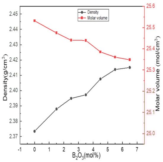 It can be seen from Figure 7 that the density of the glass increased with the increase in the boron oxide content, and the molar volume gradually decreased with the increase in the boron oxide content. When the content of B2O3 (mol%) increased from 0 to 5.5, combined with the fitting calculation results of 27Al, 11B and 29Si NMR spectra, it can be seen that boron and aluminum atoms mainly existed in four-coordinated forms, acting as network formers; N4 and Q4(0Al) increased, and the network structure shrank, while the structure density and integrity were strengthened.