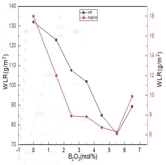 When B2O3 (mol%) = 6.5, the weight loss rate of glass in hydrofluoric acid solution and alkali solution increased, and when B2O3 (mol%) = 5.5, the chemical stability of glass appeared to have an extreme value. When B2O3 (mol%) = 6.5, the contents of [AlO6] and [AlO5] in the glass were the highest. [AlO6] and [AlO5] generally cause the prominent Si-O bond to break around it. The unstable polar covalent bond requires more R2+ for charge neutralization and increases the sensitivity to acid or alkaline olutions due to its relatively relaxed structure that promotes the acceleration of ion transport.