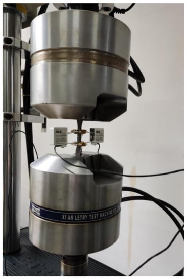 In this paper, the specimen was produced by arc welding, and the parental material was low-alloy high-strength steel Q345. The dimensions are shown in Figure 1. The total length of the specimen was 140 mm, and the length of the measuring region in the middle was 40 mm. The width was 8 mm and the thickness was 6 mm. The chemical composition of the steel is listed in Table 1. The specimen was grasped by the upper and lower clamping heads, as shown in Figure 2. For the monotonic tensile test, the tensile rate was 0.001 mm/s, and all tests were conducted at room temperature on account of testing standard GB/T228.1-2010. The stress–strain curve is shown in Figure 3. The mechanical parameters are listed in Table 2. The low-strength matching approach was utilized to connect the material, and so that the mechanical parameters in the welded area were slightly lower than those of the base metal.