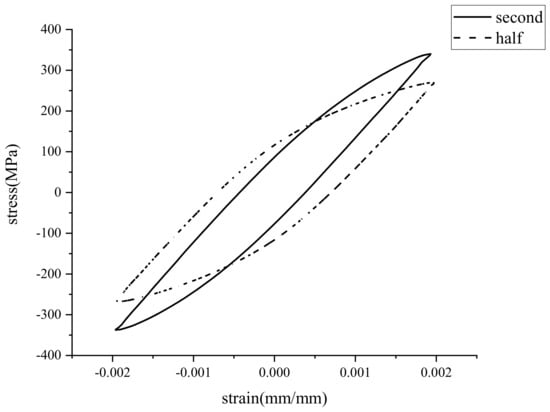 The stress–strain data at different strain levels were obtained by an extensometer, and the cyclic stress–strain response curve of an AR specimen is shown in Figure 4. It can be seen that the peak stress of the welded specimen under cyclic loadings at the half cycle was significantly lower than that at the second cycle, which showed the cyclic softening of the material.