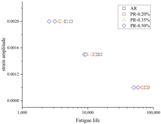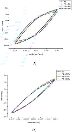 The pre-strain was produced by applying uniaxial tension along the length direction under the strain-control mode. The strain rate had a speed of 2 × 10−4 s−1, and there were three strain levels, 0.2% (named PR-0.2%), 0.35% (named PR-0.35%) and 0.5% (named PR-0.5%). Then, the final residual stretching pre-strain on the specimen was 0.06%, 0.21% and 0.35%, respectively. The test without pre-strain was marked as AR. Then, based on the strain control, fatigue tests were conducted on the specimens at three strain amplitudes of 0.2%, 0.15% and 0.1%. All tests were carried out with a stress ratio of R = −1 according to the testing standard GB/T15248-2008. The loading frequency was from 0.5 Hz to 1 Hz.
