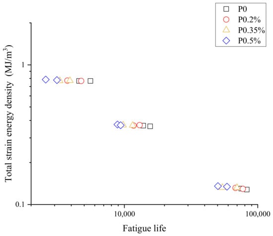 Based on the strain energy density method mentioned above and experimental data, the elastic, plastic and total strain energy densities of the welded specimen with and without pre-strain are listed in Table 3. The relationship between the total strain energy density and fatigue life is shown in Figure 9.