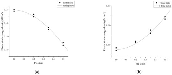 Relationship strain energy density and pre-strain at 0.15% strain amplitude. (a) Elastic strain energy density and pre-strain; (b) Plastic strain energy density and pre-strain.