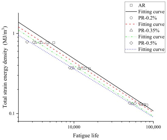 The fatigue parameters of the welded specimen in Equation (12) were determined from the data in Figure 10, and are listed in Table 4. The relationship between the total strain energy density and fatigue life are shown in a double logarithmic coordinate system, as plotted in Figure 11. The fitting curves at different pre-strain levels could meet the experimental data.