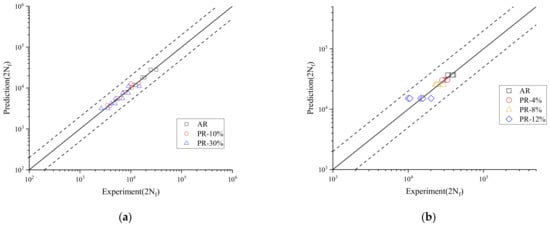 To verify the applicability of the suggested model, the estimated life span of steel Fe-18 Mn with and without pre-strain based on Equation (12) was close to the experimental data [32], shown in Figure 12a. Figure 12b shows that the predicted lifetime of complex-phase steel CP800 with and without pre-strain based on the suggested model matched well with the tested data [36]. The black dashed lines are used to represent the scatter band of fatigue life with an error factor of two. All data were in the region between the two dashed lines. The results indicated that the model could describe the effect of the pre-strain on the fatigue properties of welded joints very well.
