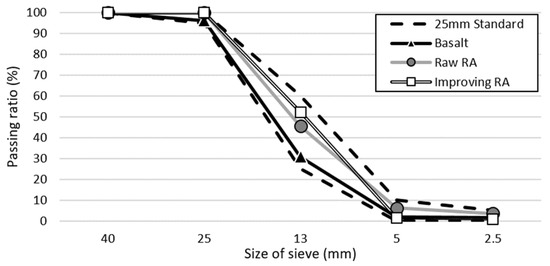 According to the literature, basalt is classified into 16 types through petrological classification, and its quality varies depending on the environment and region [20]. Numerous studies have used overseas basalt as high-strength aggregate because of its low porosity. Basalt found in Jeju Island has a relatively high porosity, and the water absorption of basalt aggregate ranges widely from 0 to 10% [21,22,23,24,25,26,27]. Basalt from aggregate quarries has a water absorption of approximately 3%. Recycled aggregate containing basalt exhibits relatively high water absorption; it has higher water absorption than other rock aggregates distributed in the inland areas of Korea (approximately 1%) [28]. In addition, an increase in specific surface area through the internal and external basalt pores can significantly degrade the quality of recycled aggregate because the increase adversely affects the removal of old paste and old mortar from waste concrete.