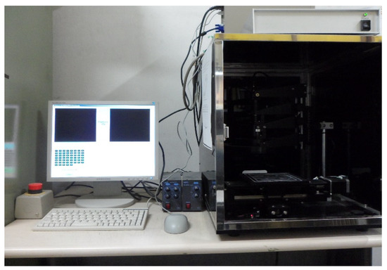 We conducted experiments in accordance with ASTM standards to analyze the fresh properties and hardened properties of the concrete. Accordingly, the slump of the fresh concrete was measured twice with a slump cone (base diameter, 200 mm; top diameter, 100 mm; height, 300 mm) according to the ASTM C143:2020 [37] specifications. The air content of fresh concrete was measured with a Type-B air meter with a capacity of 7.0 L according to the ASTM C231:2017 [38] specifications. The concrete was maintained in a sealed state after the initial measurement. The compressive strengths of the cylindrical concrete specimens (diameter, 100 mm; height, 200 mm) were then determined with a stress rate of 0.25 MPa/s for three or more specimens at ages of 3 d, 7 d, 28 d, and 1 year. The compressive strength was measured in accordance with ASTM C39:2020 [39]. The modulus of elasticity was measured with a loading rate of 0.25 MPa/s for three or more specimens by attaching strain gauges to the 28-day-old cylindrical specimens; the measurement was performed by applying load in accordance with ASTM C469:2014 [40] (concrete cylindrical specimen; static modulus of elasticity) and by using the Poisson’s ratio test method. The drying shrinkage of three specimens was measured by attaching strain gauges PL-60-11 (Tokyo Sokki Kenkyujo Co., Ltd., Tokyo, Japan) to the surface of the 100 × 100 × 400-mm cuboid specimens after demolding at 7 d of curing, in accordance with the concrete drying shrinkage test method of ASTM C596:2018 [41]. In both strain-gauge applications, a data logger (Tokyo Sokki Kenkyujo Co., Ltd., Tokyo, Japan) was used to acquire data under constant temperature and humidity conditions of 20 ± 2 °C and 60 ± 5%, respectively. The freeze–thaw test was conducted using 100 × 100 × 400-mm specimens in accordance with the ASTM C666:2017 Standard Test Method for Resistance of Concrete to Rapid Freezing and Thawing. The temperature change from 4 ± 2 °C to −18 ± 2 °C was set as one cycle, and the resonance frequency was measured every 30 cycles until 200 cycles [42]. The pore structure of hardened concrete was analyzed with the linear movement method and improved pore number measurement method specified in the ASTM C457 Standard Test Method for Microscopical Determination of Parameter of the Air-Void System in Hardened Concrete. The pore structure was analyzed through the microscope of the image analysis equipment (HF-MA C01) shown in Figure 4 [43].