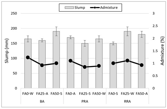 Figure 5 illustrates the concrete slump according to the coarse aggregate type and FA substitution rate. All the specimens satisfied the target slump condition of 175 ± 25 mm, and the superplasticizer amount did not differ significantly as the difference was approximately 1%. Compared to the superplasticizer amount used, the mixtures comprising BA exhibited a relatively low slump, indicating that the low sphericity of BA affected the slump. When FA was used, an additional amount of the superplasticizer was required compared to the reference mixture at a substitution rate of 25%; a higher slump than that of the reference mix was observed at a substitution rate of 50%. Previous studies have shown that FA tends to decrease slump when FA replaces weight because FA density is lower than that of cement, and the specific surface area of the binder increases [44,45]. When a substitution rate of 50% was used, the ball bearing effect of using FA had a greater impact.