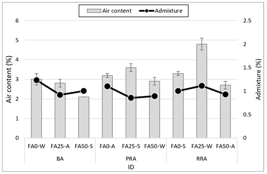 Figure 6 illustrates the air content measurement results for fresh concrete according to the coarse aggregate type and FA substitution rate. The recycled aggregate mixtures exhibited higher air contents than those of the BA mixtures, and the air content tended to decrease as the FA substitution rate increased. The tendency was not significant at an FA substitution rate of 25%, and the PRA FA25 mix exhibited the highest air content, which was due to the influence of the superplasticizer content. Regardless of the aggregate type, air content decreased at an FA substitution rate of 50%. This phenomenon can be attributed to the air adsorption occurring as a large amount of FA was used (the unburned amount increased). Regardless of the use of RRA and PRA, which had 5.4 and 2.0% higher water absorption than that of BA, air content did not increase significantly despite the application of pressure because of aggregate pre-wetting before mixing.