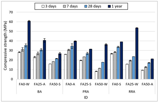 Figure 7 illustrates the compressive strength measurement results at 3 d, 7 d, 28 d, and 1 year of age for concrete containing recycled aggregate based on Jeju basalt. Different tendencies were observed depending on the aggregate type, FA substitution rate, and curing condition. First, an increase in FA substitution rate caused a reduction in compressive strength until 28 d. At 1 year, however, specimens under water curing exhibited a high strength. Particularly, PRA FA25-W, which used water curing and an FA substitution rate of 25%, exhibited a high strength of 55.1 MPa; RRA FA50-W, which used an FA substitution rate of 50%, exhibited 38 MPa. This phenomenon occurred because the strength was slowly developed after 28 d as large amounts of FA (25 and 50%) were used in the concrete. For RRA FA50-W, however, the low aggregate strength of RRA also had an impact, as well as the lack of alkalinity that develops strength with 50% FA.