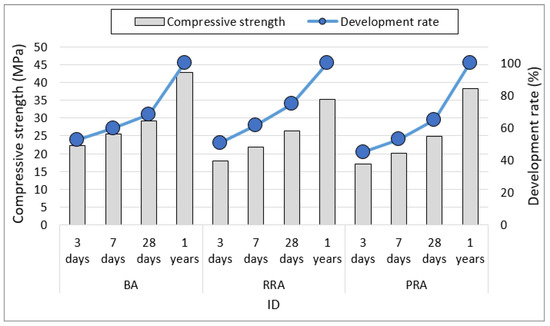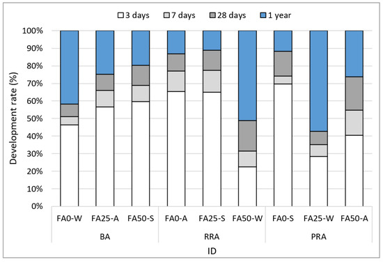 Figure 9 illustrates the average compressive strength and strength development rate according to the aggregate type. BA attained the highest compressive strength, where BA FA0-W exhibited the highest one-year compressive strength of 60 MPa. PRA exhibited the lowest compressive strength until 28 d, but no significant difference was observed between the compressive strength of the PRA mix (38.9 MPa) and that of the BA mix (42.7 MPa) at 1 year when strength development was mostly determined to be completed. In the case of RRA, high strength development did not occur but was expected because of the stimulation of FA by the alkali components of the old paste. As the concrete strength was increased by cement paste development, further strength development was difficult because of the breakage of the old paste. For the utilization of the Jeju recycled aggregate, a certain level of quality improvement and clear setting of working strength are required.