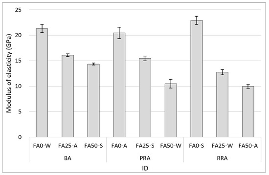 Figure 10 illustrates the modulus of elasticity of hardened concrete containing B-RA at 28 d. The concrete variables were the aggregate type, FA substitution rate, and curing condition. The modulus of elasticity clearly decreased as the FA substitution rate increased. The modulus of elasticity apparently decreased in proportion to the reduction in compressive strength caused by the increase in FA substitution rate. Overall, the BA mix attained the highest modulus of elasticity, but PRA FA0-S exhibited the highest value of 22.9 GPa. This phenomenon likely occurred because the increase in filling performance resulting from using PRA with a high sphericity in the normal strength region affected the pore reduction, even though PRA FA0-S had a lower compressive strength than that of BA FA0-W. This tendency is consistent with the results of a previous domestic study on porous basalt recycled aggregate in Jeju Island; recycled aggregate concrete containing a certain level of old paste in the parent rock (basalt) with a relatively large number of pores (basalt) will not significantly affect the modulus of elasticity in the normal strength region [33].