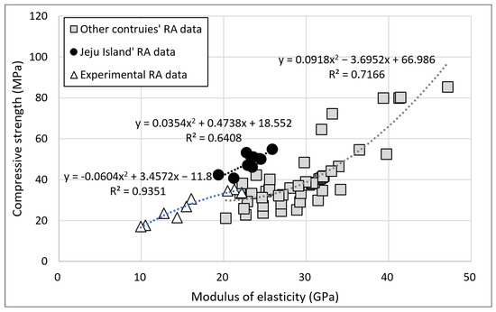 Figure 11 illustrates the relationship between the modulus of elasticity and compressive strength for concrete with B-RA; the data were obtained from the literature [46,47,48,49,50,51,52,53,54,55,56,57,58,59,60,61,62,63]. The water absorption of most overseas basalt is less than 1%. Therefore, the recycled aggregate concrete comprising low-porosity basalt as the parent rock exhibited a high modulus of elasticity compared with compressive strength. For Jeju basalt, on the contrary, the modulus of elasticity was low compared with compressive strength because of high porosity with water absorption of approximately 3%. These results are similar to Jeju B-RA results; however, the slope of the trend line differed because of differences in the unit weight of cement.
