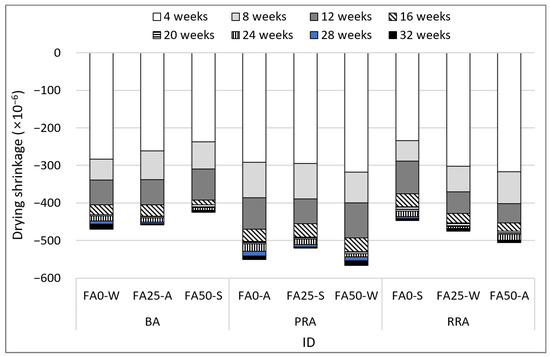 Figure 12 illustrates the drying shrinkage of concrete comprising B-RA. Shrinkage clearly decreased for the specimens subjected to steam curing. This phenomenon apparently occurred because a relatively large amount of moisture was used at the beginning as reaction was promoted at a high temperature of 60 °C during steam curing. In relation to the amount of FA used, drying shrinkage increased as the FA substitution rate increased for most specimens. This phenomenon likely occurred because the concrete was dried without the consumption of free water due to the slow reaction of FA. The use of recycled aggregate increased drying shrinkage, and no significant difference was found in drying shrinkage between the PRA and BA specimens. Figure 13 illustrates the relationship between drying shrinkage and the absorption of coarse aggregate. For the first four weeks with a large drying shrinkage, no clear drying shrinkage tendency was observed for the absorption of aggregate; likewise, no significant difference was observed in shrinkage depending on the absorption of recycled aggregate. Over time, the influence of the absorption of aggregate on drying shrinkage became clear. At 32 weeks, the difference in drying shrinkage between RRA (absorption: 5.9%) and PRA (absorption: 4.2%) increased as the tendency became clearer. Thus, the influence of the aggregate on drying shrinkage increased over time, and quality improvement considerably reduced drying shrinkage.