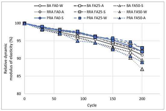 Figure 14 illustrates the relative dynamic modulus of the elasticity of concrete comprising B-RA according to freezing and thawing. When the FA substitution rate was 25%, the relative dynamic modulus of elasticity increased until 200 freeze–thaw cycles were reached. This phenomenon occurred because the FA reacted with calcium hydroxide without extracting it from cement to the outside, and the matrix was reinforced by the pozzolanic reaction [64]. At an FA substitution rate of 50%, however, the relative dynamic modulus of elasticity increased regardless of the aggregate type. The increase occurred because freezing and thawing were affected by compressive strength, pore distribution, and micro-matrix. We estimate that the freeze–thaw resistance was reduced by low compressive strength at an FA substitution rate of 50%.