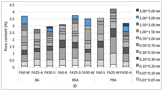 Figure 15 illustrates the pore distribution for the concrete specimens, and Figure 16 illustrates the spacing factor and specific surface area of concrete according to the concrete pore distribution. The pore content in concrete had the same tendency as the air content measured according to pores of 1 mm or less caused by entrained air. This phenomenon occurred because the entrained air in fresh concrete was hardened without being broken. Image analysis showed that the entrained air included large and small air bubbles in the basalt (including the one in the recycled aggregate) and old paste. Thus, the specimens that comprised RRA and PRA, which have higher absorption than that of BA, exhibited a relatively higher pore content.