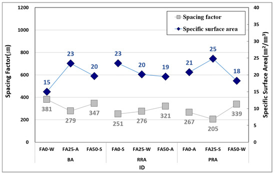 According to the Mindess and Kansas DOT standards, the freeze–thaw resistance is high when the spacing factor is 250 µm or higher, and the specific surface area is 25 mm2/mm3 or larger [65]. The PRA FA25-W specimen satisfied these criteria and exhibited a high relative dynamic modulus of elasticity according to freezing and thawing. Figure 17 illustrates the relationship between the spacing factor and relative dynamic modulus of elasticity of concrete. Compared to the specific surface area, the spacing factor exhibited a high tendency with the relative dynamic modulus of elasticity. Although the specimen strength caused a deviation from the high tendency, the freeze–thaw resistance was high as the spacing factor decreased. In the case of recycled aggregate, the freeze–thaw resistance was high regardless of its quality. This phenomenon occurred because the pores included in the old paste of recycled aggregate reduced the spacing factor.