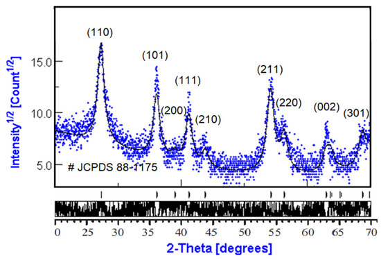 Analysis of XRD data was performed using MAUD software (Material Analysis Using Diffraction version 2.97, Radiographema, University of Trento, Trento, Italy, http://maud.radiographema.eu/, accessed on 22 May 2022). This is a general diffraction/reflectivity analysis program mainly based on the Rietveld method and whole-profile pattern fitting. The Rietveld method was selected for analysis because of the nanopowder structure of TiO2 samples (Table 1). The best fitting was obtained in the isotropic model of nanocrystals with a size of 10.5 ± 0.2 nm; the phase composition was 100% rutile TiO2 (Table 2).