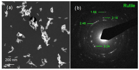 TEM was used to further examine the particle size, crystallinity, and morphology of the samples. TEM field images of TiO2 nanopowders in the rutile phase are shown in Figure 2a. It can be estimated that the particle size of powders in Figure 2a was nanoscale with a grain size of about 10 nm. The corresponding selected area electron diffraction (SAED) patterns of nano-TiO2 powders in the rutile phase are shown in Figure 2b. These are in agreement with the XRD results in Figure 1. In Figure 2b, the selected area electron diffraction (SAED) patterns of nano-TiO2 powders in the rutile phase showed spotty ring patterns without any additional diffraction spots and rings of second phases, revealing their crystalline structure. The size, shape, and surface morphology of the rutile TiO2 materials were studied using FESEM, and the images are presented in Figure 3. The rutile TiO2 was found to possess submicron particles consisting of a few fused needle-shaped nanoparticles. The nano-resolution imaging of these particles revealed the presence of nanocrystalline domains, corresponding with data of other authors [16,17,18].