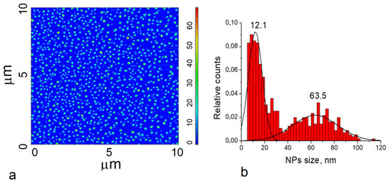 For the removal of the background of the Raman spectra and a comparison of the measured data with literature data (RRUFF Project database, http://rruff.info/, accessed on 25 May 2022), we used CrystalSleuth software (http://rruff.info/about/about_download.php, accessed on 25 May 2022). The Raman spectrum of TiO2 (black line) correlated well with the RRUFF data (blue line). The Raman spectroscopy results (Figure 4) confirmed that the typical structure of titanium oxide was rutile in the tetragonal space group. Rutile has four Raman active modes, B1g, B2g, Eg, and A1g. The bulk Raman frequencies of the rutile phase are at 143 (B1g), 447 (Eg), 612 (A1g), and 826 (B1g) cm−1. In a perfect infinite crystal, only phonons close to the center of the Brillouin zone (BZ) contribute to inelastic scatterings of incident radiations. When crystal sizes range in the nanometer scale, a larger portion of the BZ is allowed to effectively participate in scattering processes due to the weakening of the selection rule at q0 ≈ 0. Therefore, a variation in the Raman frequency peaks and the shape of the Raman band can be observed. To determine the shape and size of the TiO2-NPs (rutile) used in the present work, the samples were imaged using an atomic force microscope. Figure 5 shows the size analysis results of TiO2-NPs (rutile).