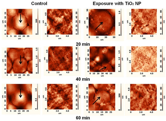 Representative AFM images of CHO control cells and cells after 20, 40, or 60 min exposure to TiO2; the first and the second columns show images of the topography of the whole cell and cell plasma membrane ultrastructure (5 × 5 µm), respectively, in the cases of the control; the third and the fourth columns show images of the topography of the whole cell and cell plasma membrane ultrastructure (5 × 5 µm), respectively, after exposure to TiO2-NPs. Investigated cells are indicated by arrows in the whole-cell images of the topography.