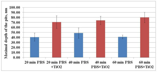 Figure 7 shows the dependence of the maximal depth of the pits on the exposure time of CHO cells to TiO2-NPs when compared to the control level. The maximal depth of the pits after exposure to TiO2-NPs for 20, 40, and 60 min was 70.73 ± 12.53, 74.07 ± 8.13, and 79.92 ± 10.41 nm, whereas, in the case of the control sample, these values were 40.61 ± 8.05, 48.82 ± 10.25, and 41.17 ± 3.70 nm, respectively. Hence, the maximal depth of the pits after the treatment with TiO2-NPs was 100% higher than the control values.