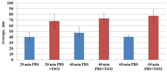 Ruenraroengsak and coauthors analyzed live transformed human alveolar epithelial type 1-like cells exposed to amine-modified polystyrene latex nanoparticles (NPs) NPs using hopping probe ion conductance microscopy and observed severe damage and holes on cell membranes [24,25]. To quantitatively assess the CHO cell’s surface changes, surface roughness analysis was conducted. Surface roughness factors (10-point height (Sz) and average) were determined. Figure 8 shows the results of Sz factor determination. The Sz factor after CHO cell exposure to TiO2-NPs for 20, 40, or 60 min was higher compared to the control (after exposure to TiO2-NPs—53.22 ± 6.60, 64.36 ± 5.78, and 60.39 ± 4.37 nm vs. control—35.92 ± 5.82, 41.43 ± 5.47 and 39.10 ± 2.32 nm, respectively) (Figure 8). A similar tendency was observed for estimation of the average (Figure 9) factor. The results suggest that changes in cell surface roughness were influenced by the impact of TiO2-NPs.