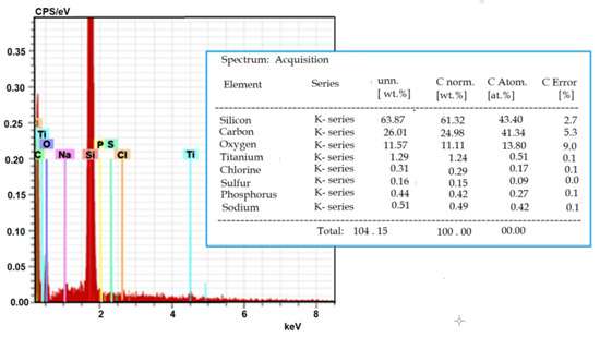 Figure 10 shows the results of the EDS analysis. It was established that TiO2-NPs were accumulated inside the CHO cells (Ti constituted 0.51% of the total observed elements). The high value of Si was a consequence of the used silicon substrate.