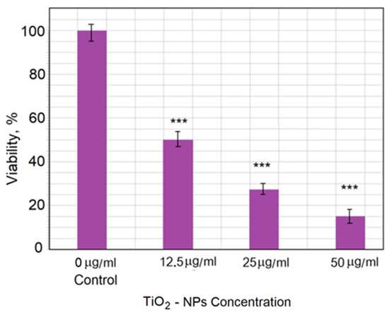 Viability of CHO cells after treatment with TiO2-NPs at different concentrations. The data are expressed as the mean ± standard error (SE) from three independent experiments. Statistical analysis was performed using Student’s t-test (*** p < 0.005). All data for TiO2-NP treatment were statistically significantly different from the control (p < 0.005) (marks are not displayed in the histogram), as well as between 12.5 μg/mL TiO2-NP and 50.0 μg/mL TiO2-NP treatments (p < 0.005).