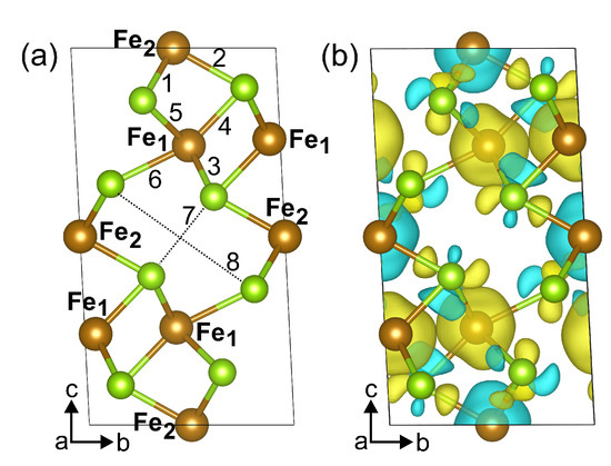 - Singh, D.; Gupta, S.K.; He, H.; Sonvane, Y. First-Principles Study of the Electronic, Magnetic and Optical Properties of Fe3Se4 in Its Monoclinic Phase. J. Magn. Magn. Mater. 2020, 498, 166157. [Google Scholar] [CrossRef]
